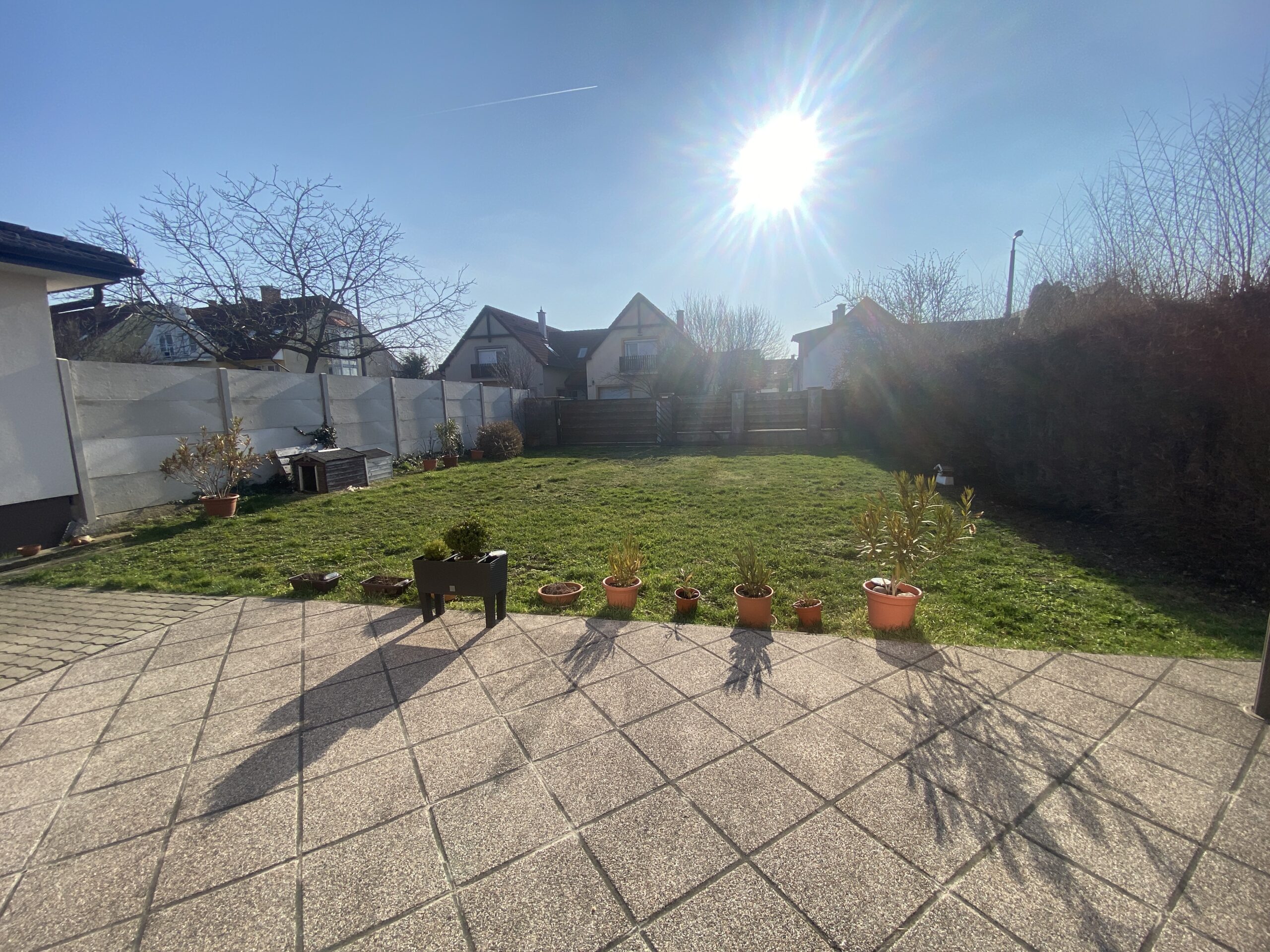 Az udvar első fele térköves, a hátsó rész pedig füves terület