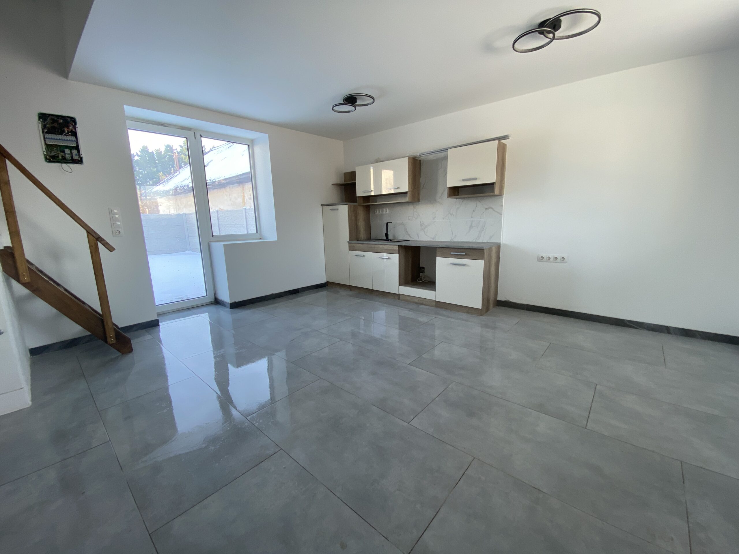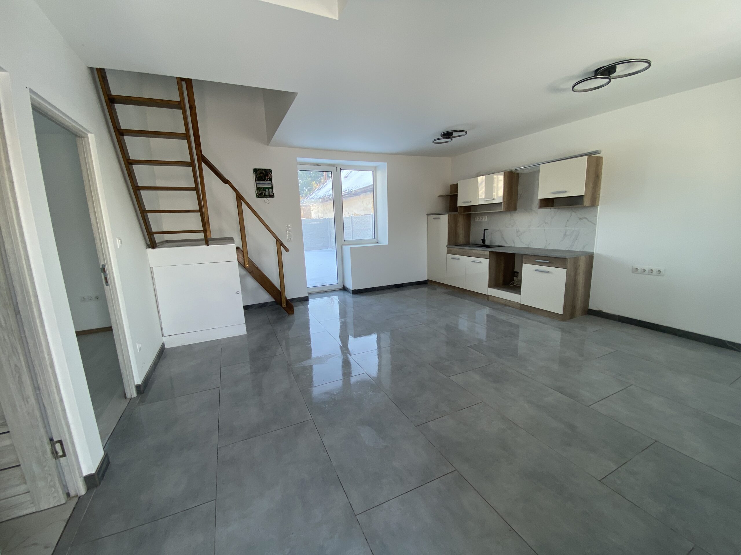 Az ingatlan alsó szintje NAPPALI + KONYHA – FÜRDŐSZOBA – SZOBA